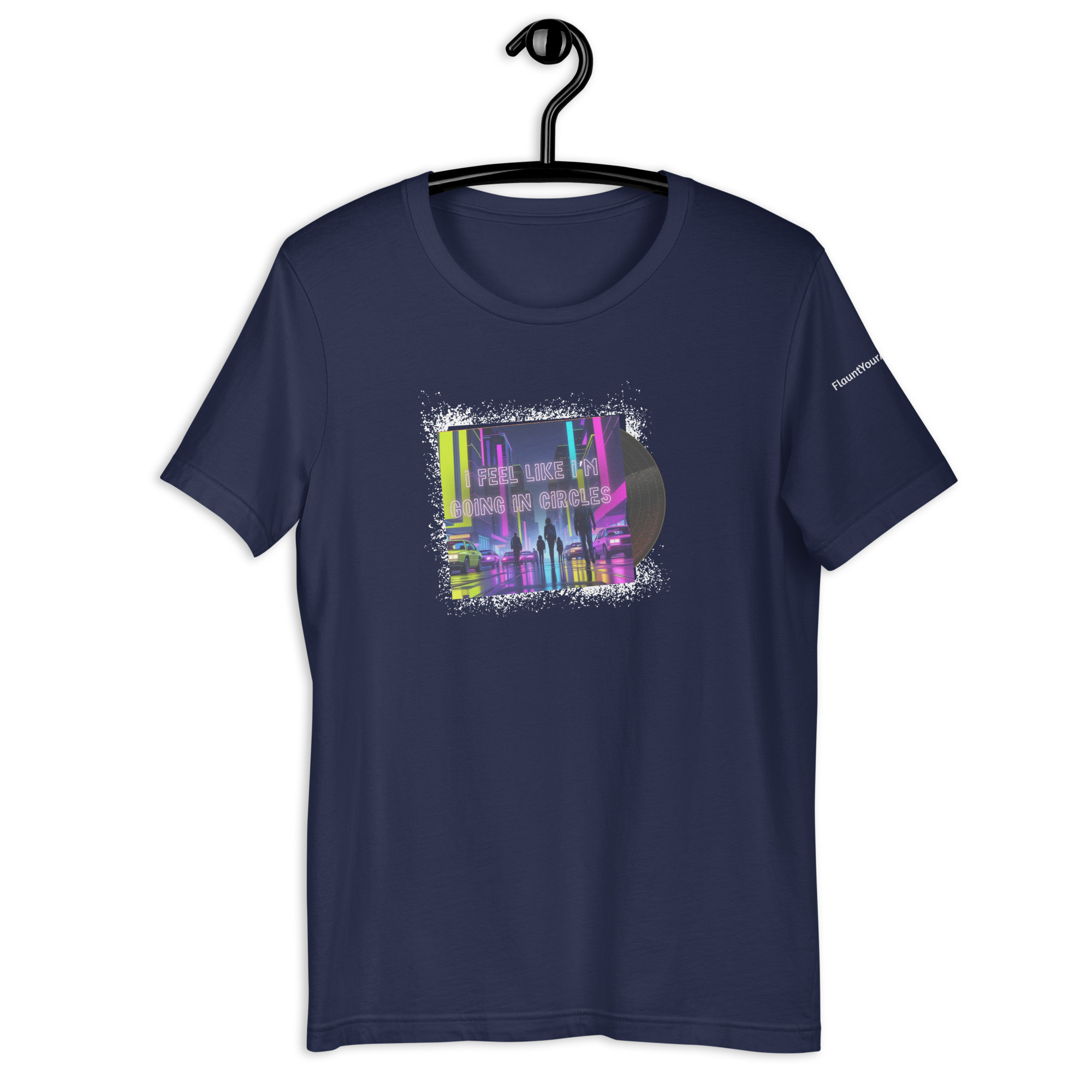 With its vibrant synthwave aesthetic, this shirt is a tribute to the energy of classic 1980s music. The design features bold, album-art style graphics with a futuristic cityscape lit in electric pink, yellow, purple, and blue tones. Beneath glowing skyscrapers, surrounded by vintage cars, Several silhouetted figures are walking down a city street, all heading in the same direction giving a sense of repetition or monotony. The street is slick with rain, reflecting all the vivid lights from buildings and cars. while the bold text “I FEEL LIKE I’M GOING IN CIRCLES” blazes across the front in glowing neon lights.